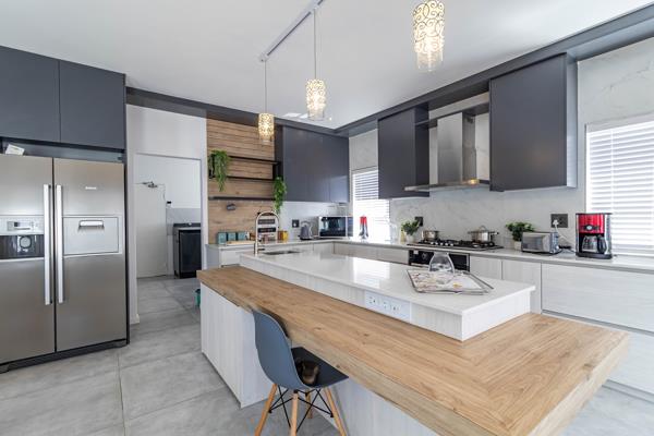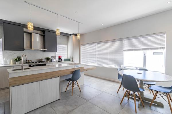 The open-plan kitchen, dining and lounge area creates a generous, flowing space ideal for relaxed evenings or lively gatherings. The kitchen is fitted with a gas stove and electric oven, and a scullery-cum-laundry zone adds practicality. Between the two upper-floor bedrooms - each boasting a spacious balcony - lies a cozy pajama room that serves as a private retreat for reading, relaxing, or a quiet home office.