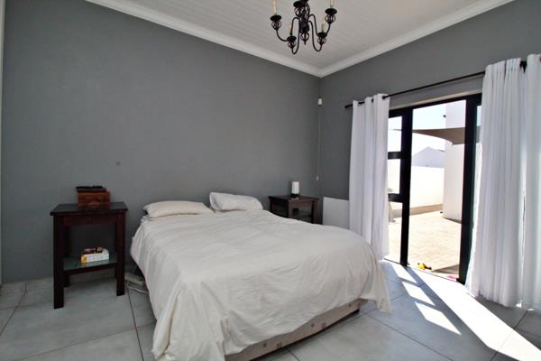 The master bedroom is a tranquil retreat with built-in cupboards and direct access to the courtyard. The luxurious ensuite bathroom boasts a corner bath, walk-in shower, double basins, and toilet.