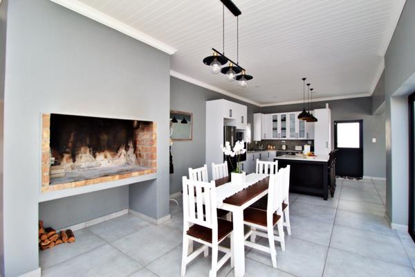 Step inside to a beautifully designed open-plan lounge with a fireplace, a dining area featuring an indoor braai, and a stylish kitchen.