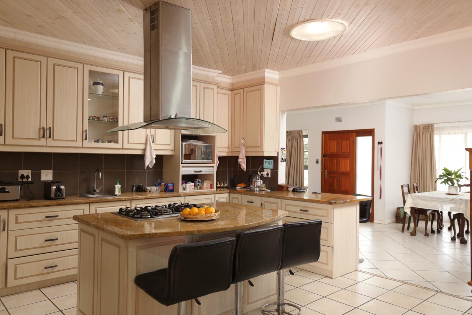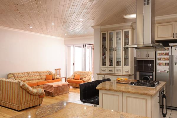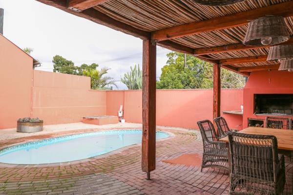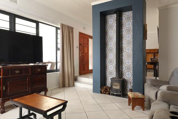 This home offers as you enter - the lounge to the right with cosy fireplace. The open plan kitchen connects to a dining area and lounge that opens up with stacker doors to the outside entertainment area with braai and a swimming pool. The well equipped kitchen offers plenty of cupboards and a separate scullery/ laundry.