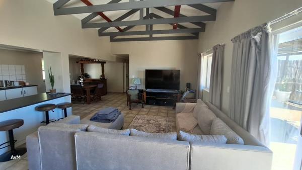 Step inside and discover a wonderfully open-plan living area that truly feels spacious and inviting. High vaulted ceilings with exposed beams add a touch of character and an airy feel, while large windows and sliding doors flood the space with natural light. The tiled flooring throughout is practical and easy to maintain. This home features a comfortable lounge, a dedicated dining room, and a fantastic kitchen with ample counter space and a handy breakfast bar perfect for casual meals or entertaining friends. You''ll also find a cozy fireplace for those cooler evenings and a built-in braai room, making indoor entertaining a breeze. Plus, there is even a dedicated bar area with wine storage, ready for your next get-together.
