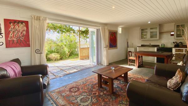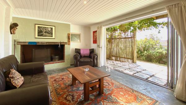 The open-plan living area seamlessly connects to the patio and garden, complemented by a warming fireplace and a practical kitchen.