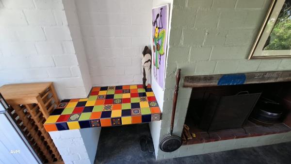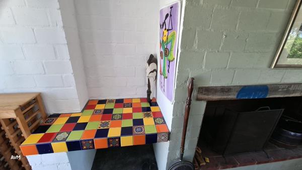 Inside, youll discover a unique and eclectic open-plan living space that truly feels like home. The lounge, dining room, and kitchen flow together beautifully, making it super easy to entertain or just chill out. Imagine cozy evenings by the fireplace, which features a vibrant, multicolored tiled counter that adds a real pop of character. The white painted brick walls and concrete-style flooring give the space a rustic yet clean feel, while a large window lets in plenty of natural light. The kitchen is practical and charming, boasting an L-shaped setup with ample storage, a classic farmhouse sink, and a spacious dining table perfect for family meals or hosting friends.