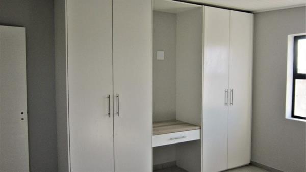 Three bedrooms, each with built-in cupboards and ample natural light. The main bedroom includes a private en-suite bathroom, positioned for privacy away from the other bedrooms.