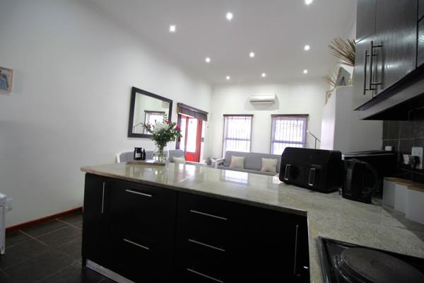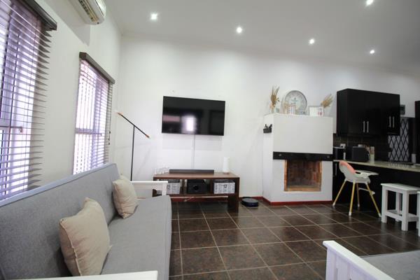 As you enter, youre greeted by an open-plan kitchen featuring sleek black built-in cupboards, creating a modern yet welcoming space. The kitchen seamlessly flows into a spacious living room, complete with an air-conditioner for cooling and a built-in fireplace for warmth or the perfect indoor braai experience. Double doors open out to an enclosed braai area, ideal for entertaining family and friends.