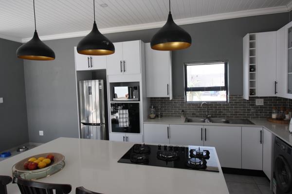 Modern Kitchen with stylish finishes and ample built-in cupboards. Ceasar stone tops, eye-level oven, and gas hob.
