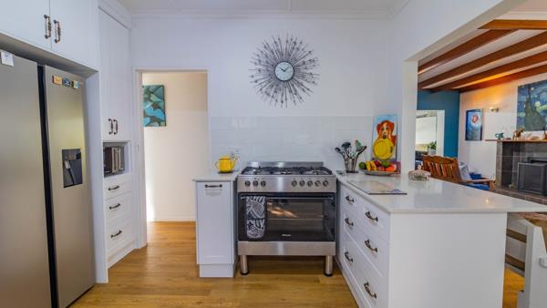 The main home welcomes you with a cozy lounge featuring a fireplace, a dining room for family meals, and a beautifully renovated kitchen with crisp white cupboards, quartz countertops, a 5-plate gas stove, pantry, and space for a dishwasher.