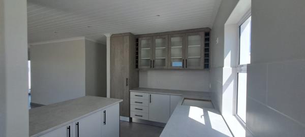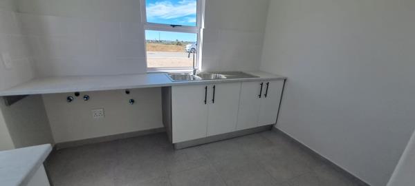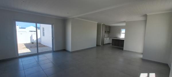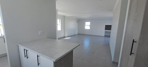 This house presents three bedrooms, two bathrooms (including one en-suite), an open-plan living area with a built-in braai, a kitchen, and a double garage. The finishes are of top quality, featuring tiles and a paved driveway.
