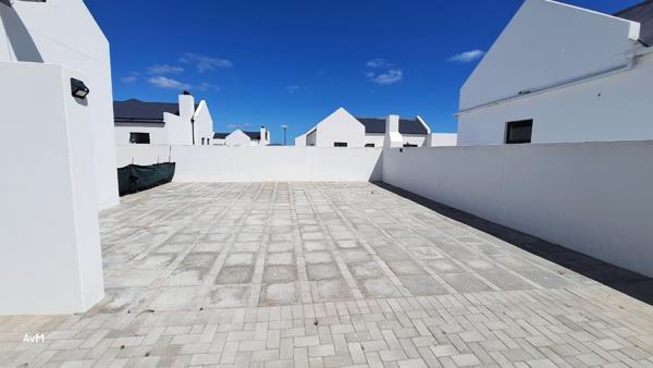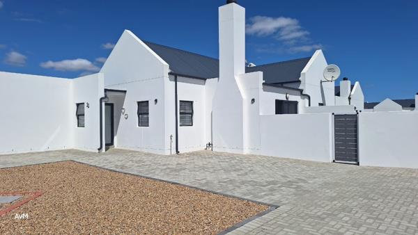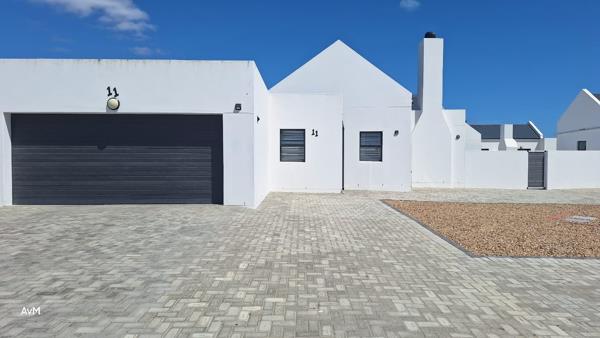 Discover modern living in this newly constructed home, perfectly situated within a secure, gated community in Laaiplek, Velddrif. This property immediately impresses with its striking kerb appeal, featuring a crisp white facade, contemporary dark accents, and a mix of gabled and flat roof sections. The minimalist architectural design is complemented by a spacious, well-paved driveway and a low-maintenance gravel area, offering ample parking for up to four vehicles in addition to the integrated double garage.