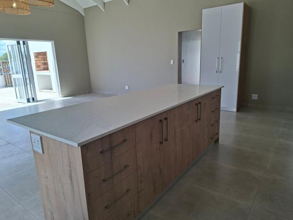 The open-plan kitchen and living area features exposed trusses, creating a light and spacious atmosphere. The modern kitchen is fitted with built-in cupboards, quartz countertops, and a 5-plate gas stove, with a separate scullery area for added convenience.