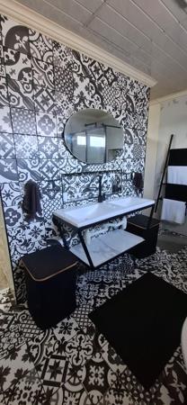 The main suite features a luxurious en-suite bathroom complete with dual basins, stylish black-and-white tiling, sleek black fittings, a spacious walk-in shower, and a bathtub creating a sophisticated private retreat.