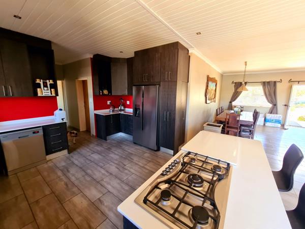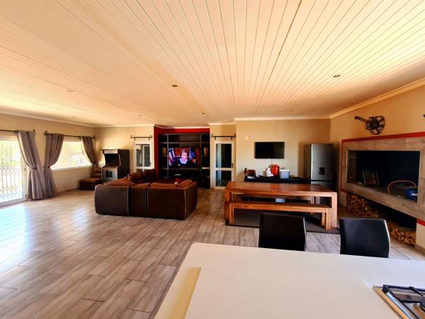 The heart of the home flows seamlessly outdoors to an impressive covered braai area and sheltered swimming pool perfect for gatherings, relaxing, or simply enjoying the view. Indoor and outdoor living merge effortlessly, creating a home that feels spacious, welcoming, and connected to its surroundings.