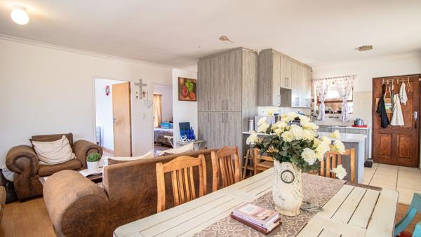 The open-plan lounge and dining area create a spacious and welcoming atmosphere, ideal for both relaxation and entertaining guests. A covered patio extends the living space outdoors, providing a lovely area to enjoy fresh air and family time. The yard is fully fenced with a sliding gate, ensuring privacy and security.