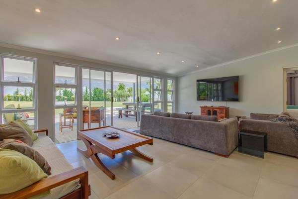 The heart of the home is its vast open-plan kitchen, seamlessly connecting to the dining and living areas. Entertain with ease as guests mingle in the spacious living room, flowing effortlessly onto the covered patio that offers panoramic views of the Olifants Rivier Berg.