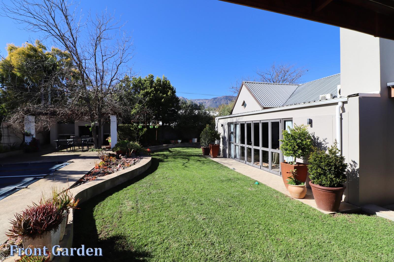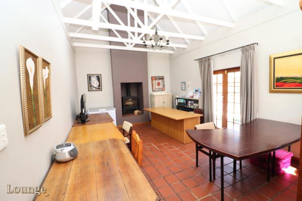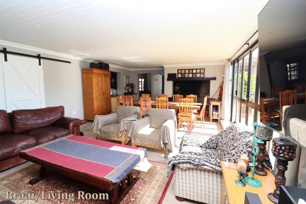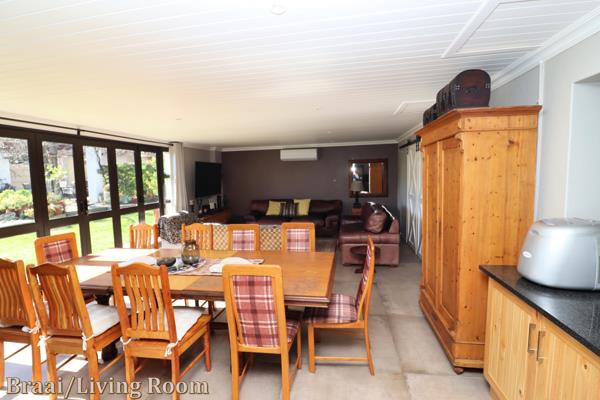 oThe spacious lounge/TV room has an inside braai area and sliding doors opening onto an established garden, a pool, and an outdoor braai area.