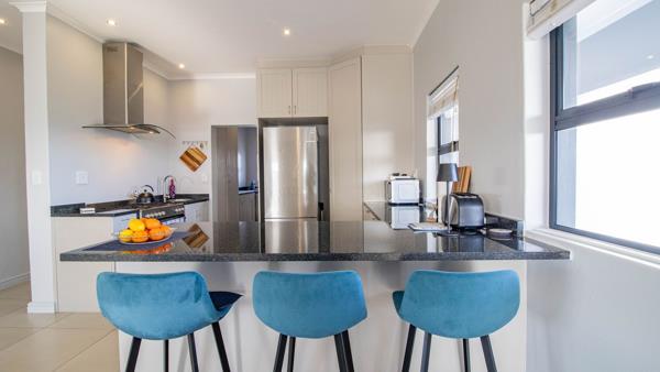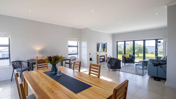 The stylish kitchen features an open-plan layout with a dedicated dining area and a separate scullery, providing ample space for culinary creativity. The home is bathed in sunlight, especially on the northern side, where a large stoep (veranda) invites you to enjoy your morning coffee or an evening sundowner.