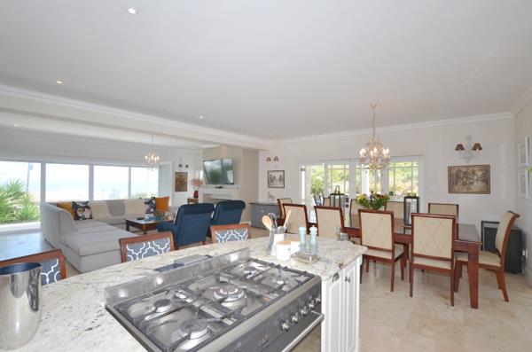 A welcoming entrance hall leads into spacious, interconnecting lounge, dining, and kitchen areas, all designed for effortless flow and relaxed entertaining. These living spaces open onto both front and rear entertainment terraces, where stacking doors invite in the fresh sea air and frame sweeping views of the Atlantic Ocean.