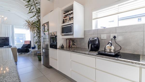 The architecture is centered around maximizing the stunning surroundings, with clever features like butt-jointed glass corners that frame uninterrupted views of the Atlantic Ocean. Step inside, and youre welcomed by an open-plan living area that forms the heart of the home. This space effortlessly integrates the lounge, dining area, kitchen, and braai courtyard, fostering a sense of togetherness that is perfect for family living and entertaining. The kitchen features sleek neutral white cabinets, black granite countertops, and an oversized centre island that anchors the space. A separate scullery with laundry facilities keeps the functional elements discreetly tucked away.