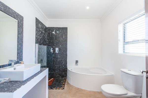 The north-facing entertainment veranda with ocean views to the west and a sweeping fynbos greenbelt to the east is a beautifully protected oasis with a built-in braai, dining zone, a 6-seater Superior Spa Jacuzzi with a built-in heat pump, and direct access to the pool.