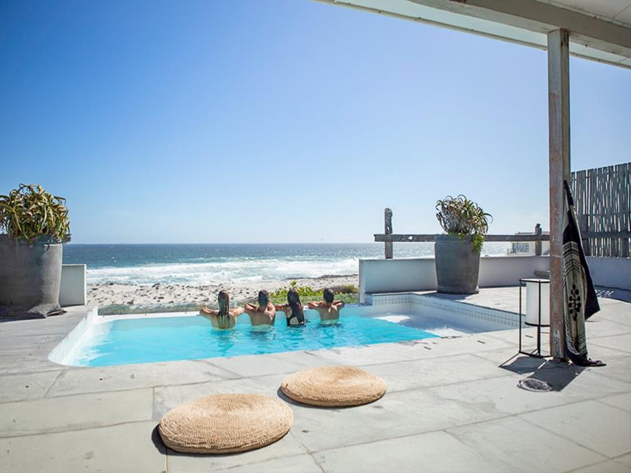 The property offers 5 bedrooms, 4.5 bathrooms, and a generous entertainment room. Outdoors, the pool overlooks the Atlantic with breathtaking views stretching from Table Mountain to Dassen Island. A greenbelt alongside the property enhances both privacy and a sense of wide-open space.