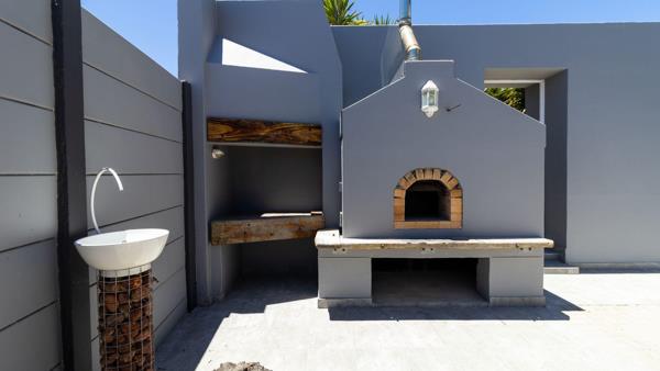 The outdoor entertainment space features an open-air braai and a pizza oven, perfect for easy coastal living.
