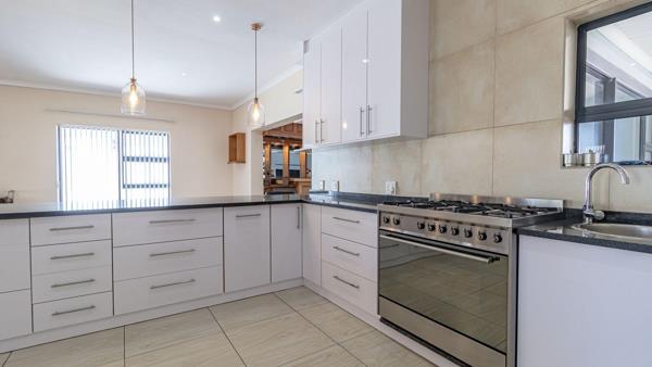The kitchen is contemporary and practical, featuring ample cupboard space, a gas hob and oven, and a double-door fridge. A separate scullery and pantry provide additional storage and room for appliances, keeping the main kitchen uncluttered and functional.