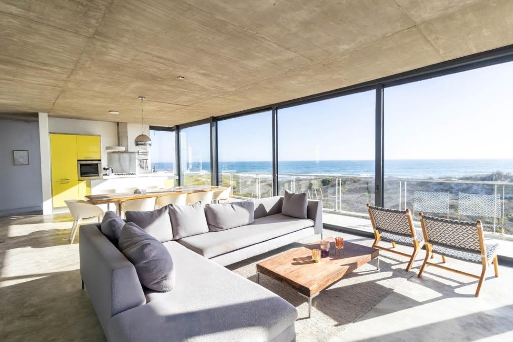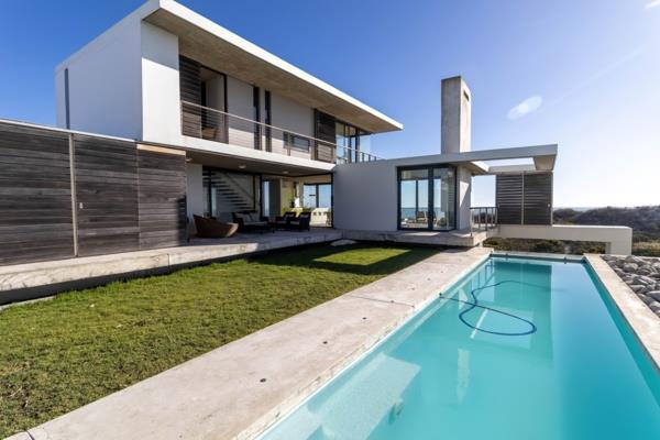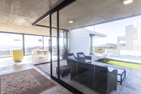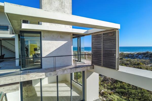 Be captivated by the most remarkable sunsets all-year round while enjoying the best of the beach life here in Yzerfontein. This breathtaking villa, designed by Stefan Antoni, is set on a prime beachfront stand in Pearl Bay, enjoying optimal privacy and boasting spectacular panoramic sea views across the Atlantic Ocean from Dassen Island in the north right across to Table Mountain in the south. The L-shaped plan shelters the north-facing outdoor living spaces, pool and garden from the southeaster winds providing for optimum indooroutdoor entertainment, especially during the summer months. The home also features large floor-to-ceiling windows and sliding doors, with Balau wood shutter screens exterior that provide protection from the late afternoon sun and other inclement weather on the West sea-facing side.