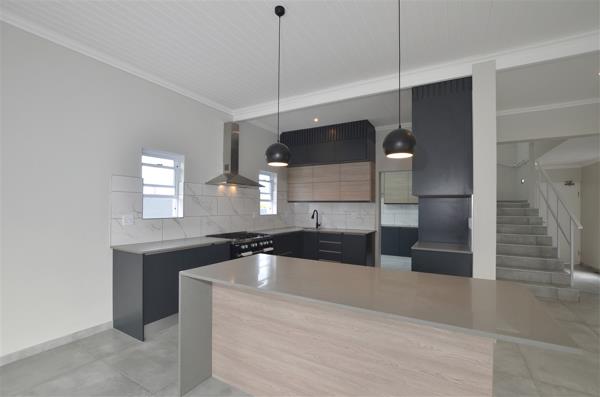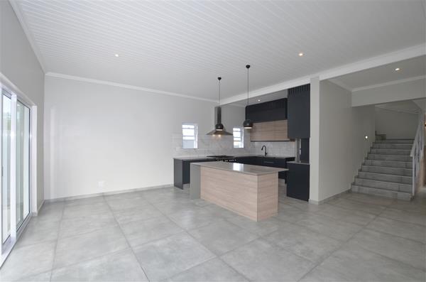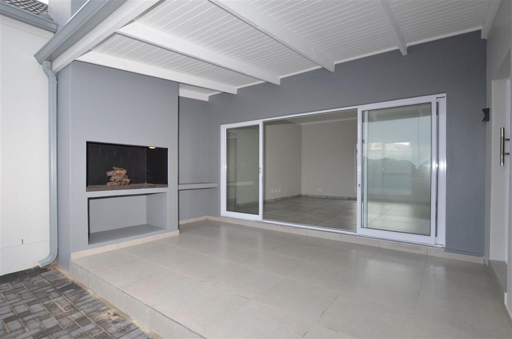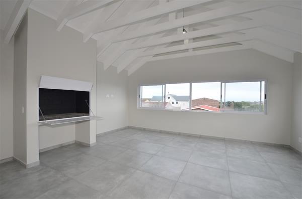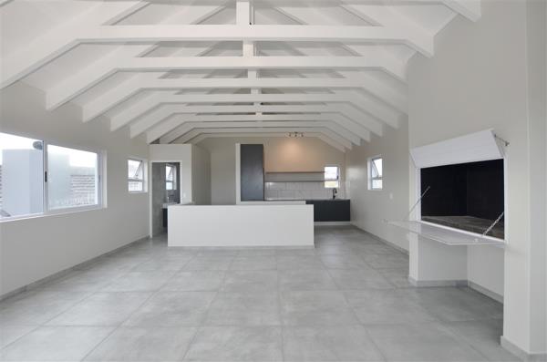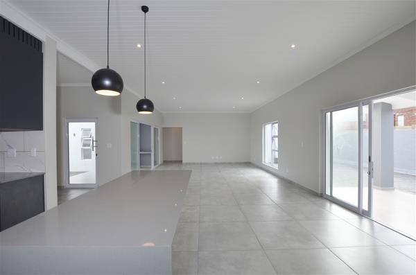 The newly built house showcases exquisite exposed trusses and clean contemporary lines, embodying sophistication and attention to detail at every turn. The spacious open-plan kitchen, seamlessly integrated with the dining and lounge areas, leads out to an inviting patio with a braai, creating a perfect setting for entertaining guests. The scullery is equipped with dishwasher points, and the garage includes a convenient laundry area with direct access outdoors.