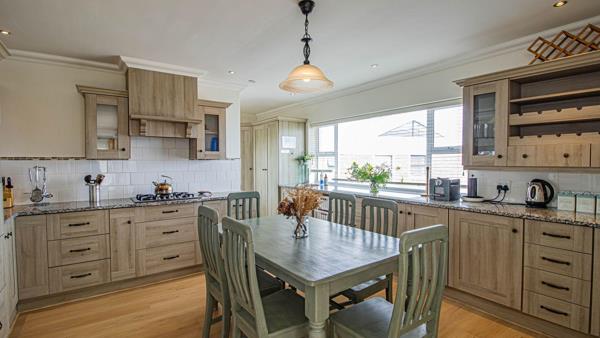 The kitchen is spacious and beautifully finished, featuring granite countertops, a gas hob, and an eye-level oven. A separate scullery and laundry keep the main area uncluttered, adding to the homes refined, streamlined feel. Newly fitted vinyl floors enhance the natural warmth of the interiors, complementing the coastal tones and textures.