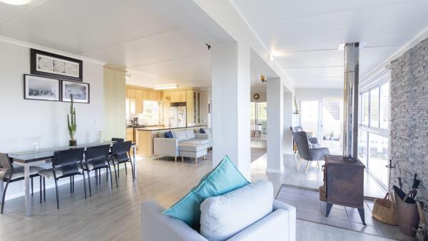 The main house on the second level is separate and private from the flatlet on the ground level, and comes with a large open plan kitchen and living area, a central fireplace, two bedrooms en-suite, two study areas, an enclosed braairoom, an open balcony and deck, with great sea views.