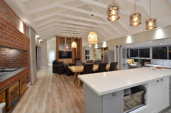 - Ground Level Retreat: On the ground level, you''ll find a private entrance leading to a downstairs retreat, currently operated as a very successful upmarket self-catering accommodation. This expansive area includes a vast open-plan entertainment zone equipped with a built-in braai BBQ and a fitted kitchen, perfect for hosting gatherings.
