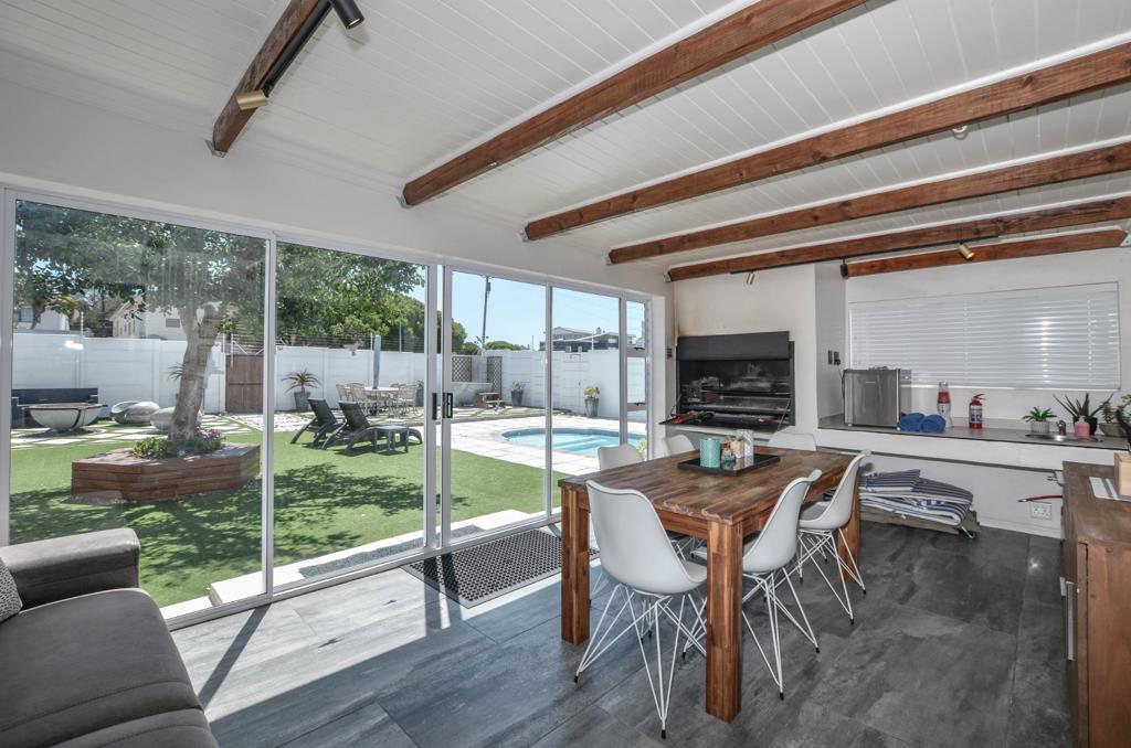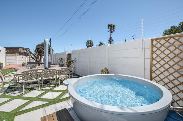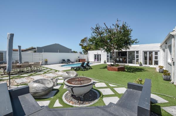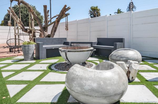 Perfect for entertaining, the property boasts a range of outdoor spaces, including a spacious backyard with a swimming pool, a Wood-fired hotpot, a braai boma, and a playground for kids.