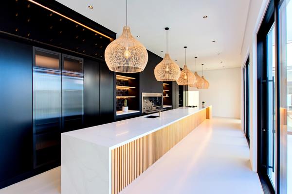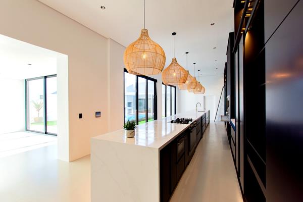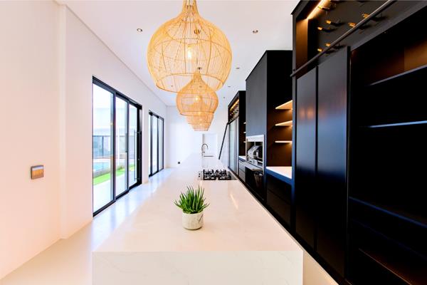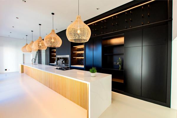 Step inside to a modern, sleek kitchen in black and gold, seamlessly connecting to the heated infinity pool area through sliding doors. Complete with a covered braai area and adjacent recreation room, the kitchen features a striking center island with elegant light fixtures. Full-height cabinets display a wine collection and include an integrated rotisserie/braai, complemented by a spacious utility area for culinary enthusiasts.