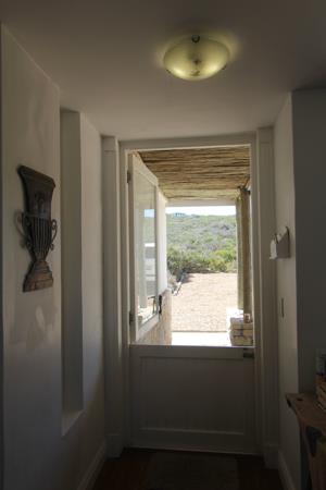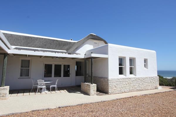 Discover the epitome of coastal living in this enchanting, thatched roof house nestled within the pristine Tygerfontein Private Nature Reserve. As you enter through the hallway, a sense of warmth embraces you, guiding you to a small cozy lounge on the left with double doors that open to a sunny patio at the back. The dining and living areas seamlessly blend into one expansive space, offering panoramic ocean views. Double doors lead to a wooden deck where you can immerse yourself in hours of sunset and ocean gazing. In the heart of this space lies a central fireplace, creating an inviting atmosphere open to both sides. The dining room gracefully connects to the kitchen, featuring a breakfast nook, oven, hob, and convenient space for your dishwasher and laundry washing machine. The back door leads to a small patio and washing lines, completing the harmonious indoor-outdoor flow.