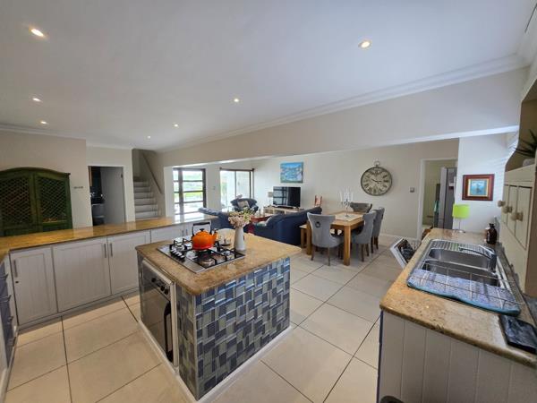 The open-plan layout of the home promotes a relaxed, family-friendly lifestyle. The ground floor features a generous lounge and dining area, adjacent to a kitchen designed with ample cabinetry, a gas hob, a gourmet oven, granite countertops, a central island, and a breakfast bar. Sliding doors from the lounge lead to a sizable patio, ideal for outdoor entertaining.