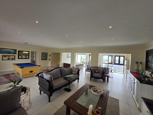 Upstairs, the expansive entertainment area is a true highlight, with a jacuzzi and large windows framing stunning ocean views. A built-in indoor braai and pool table area create the perfect setting for relaxation and socializing.