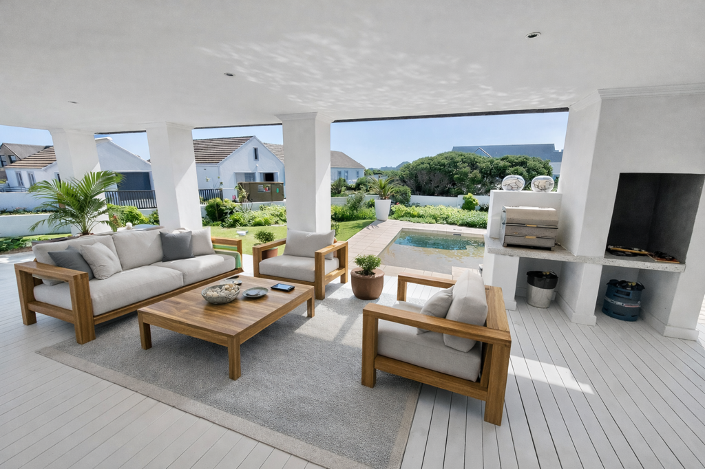 An expansive entertainment deck with built-in braai and serving counters sets the stage for unforgettable coastal gatherings. The landscaped garden and beach-entry swimming pool overlook the ocean, creating a private haven for relaxation and sunset views.
