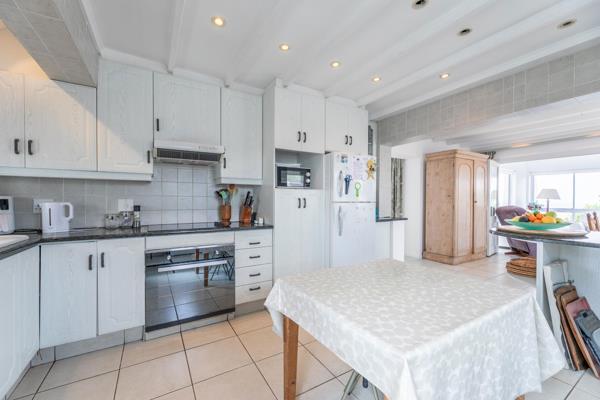 The open plan kitchen is practical with a dishwasher and washing machine point, granite tops, hob and oven . A cozy TV room with built in braai and a dining area is part of the open plan design. The braai area can be separated with sliding doors when the braai is in use .