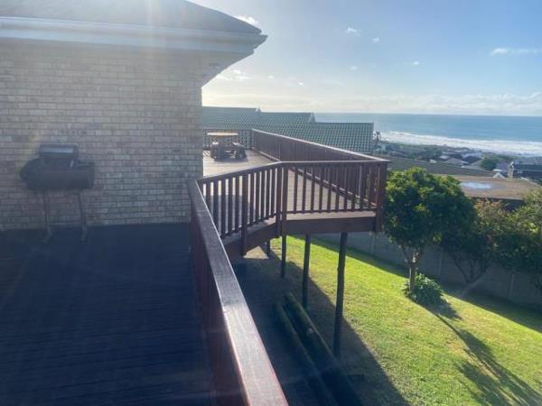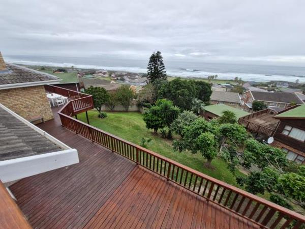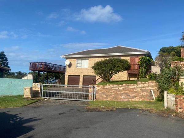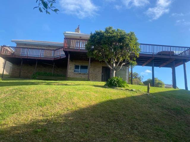 Discreetly set on a tranquil beachfront hillside, this inviting coastal home offers relaxed living with uninterrupted 180-degree ocean views. The open-plan living area flows seamlessly onto a generous deck, perfect for outdoor entertaining. The fitted kitchen includes a gas hob, electric oven and a separate scullery, while the dining area connects to a formal lounge with a built-in braai and pub.