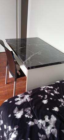 Fully furnished: bed, desk, chair, curtains