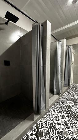 Separate bathroom with 3 showers, 1 toilets, and basins