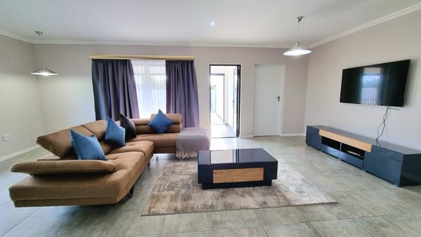 The property boasts a modern fully equipped kitchen with a scullery, where you can prepare your own meals or order from nearby restaurants. The open plan kitchen and lounge area is bright and airy, with sliding doors that lead to a built-in braai patio overlooking the garden. The patio is ideal for enjoying the sunny weather. It has a large double garage where you can park your cars securely, it is fully walled and has an alarm system and security beams for peace of mind.