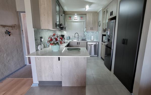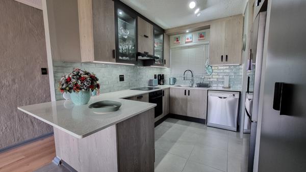 The modern kitchen boasts an abundance of cupboard space and is equipped with a dishwasher, microwave, and fridge.
