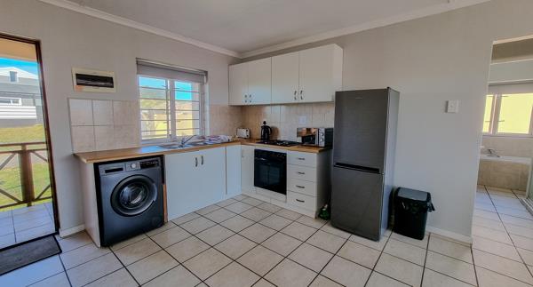It features an open-plan design encompassing a kitchen, dining area, and lounge. The kitchen is equipped with a washing machine.
