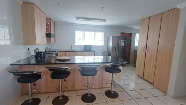 The open-plan living area flows effortlessly into an enclosed braaipatio room. Fold open the doors to reveal a beautifully kept garden, outdoor braai zone, and serene water views.