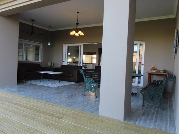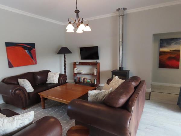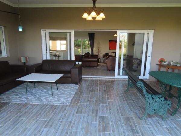 The main living area comprises of an open plan kitchen (with a separate scullery), lounge and dining room. Large sliding doors open onto the spacious patio with fynbos views, complete with a outdoor dining area, fireplace, Weber charcoal braai and comfortable couches to relax.