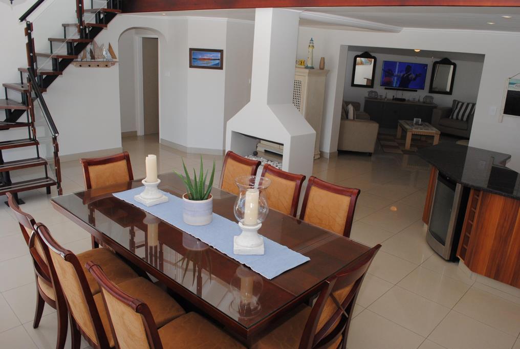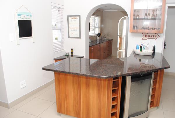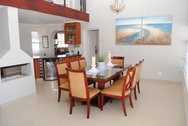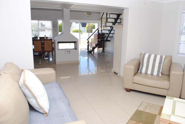 This house also has a braai room with a built in braai and stack doors that open into the garden with stairs leading down to a jetty.