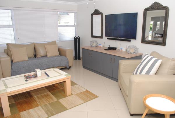 The kitchen is well designed and has a service counter from where guests can be served. Between the dining room and the lounge area is a lovely gas fireplace to heat up the living area on those cooler days. Two bedrooms downstairs with en-suite bathrooms are sunny and spacious.