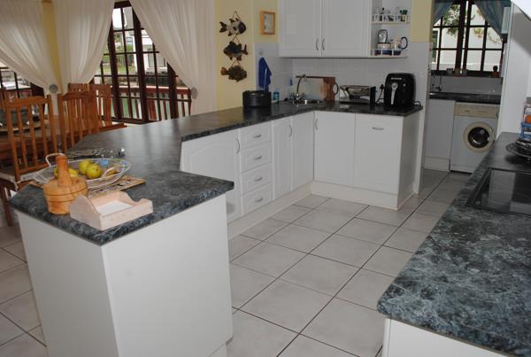 There is an open plan kitchen and dining room with a full scullery. A tiled lounge with a wood fireplace and a gas Weber to braai outside.