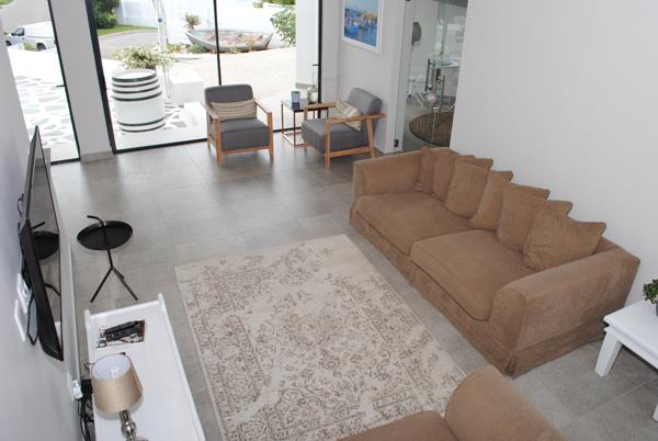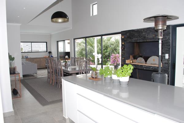 This outstanding family home is available for holiday rental, offering five en-suite bedrooms. There is a lovely entertainment area with braai, two pizza ovens, rotisserie, a Weber and lovely patio furniture. The private sparkling pool, forming part of the outside entertainment that will transport you to a Greek Island. Downstairs is a open plan modern kitchen equipped with absolutely everything you can ever need to whip up a memorable family meal. Next we have the dining room and lounge over looking the front veranda all with sliding doors.